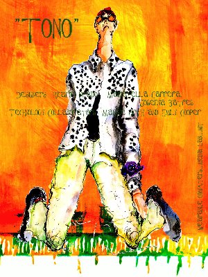TonoA guy with flash! An actor trying to get noticed in busy, competitive Hollywood! Zeek's "tono" shirt gives him a wild sonic presence! It has upwards of twenty-five sensors. As they touch his skin, the sensors transmit clock-pulses through his body to a mini MIDI board, triggering different musical events. A couple of sensors are configured so that he has to touch them with his hand in order to activate them. Shopping on Rodeo Drive, lounging at the latest trendy bar, or schmoozing with the top brass at an exclusive party, Zeek hardly even has to introduce himself. His shirt is about to make him a star!