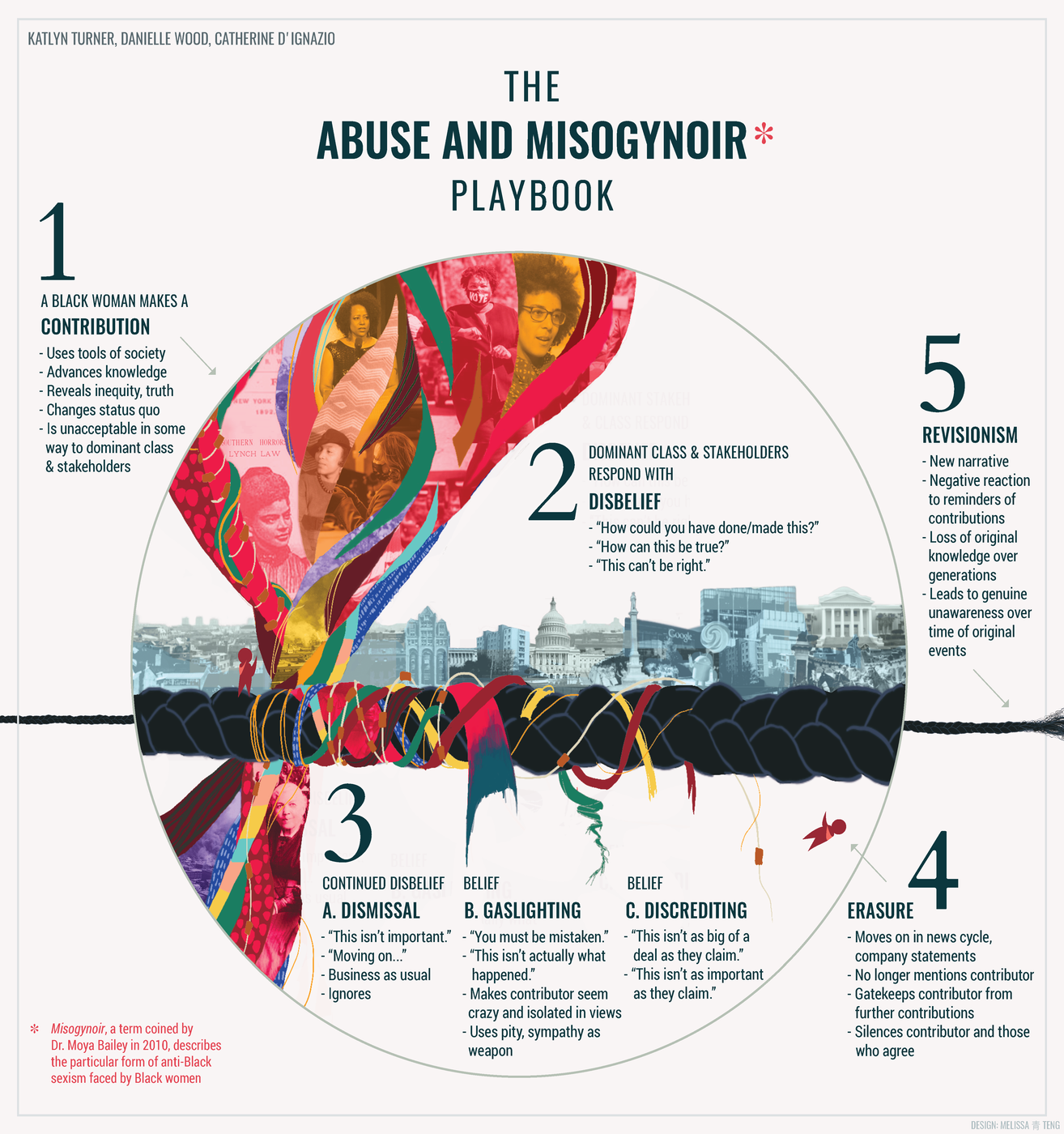 The Abuse and Misogynoir Playbook, as we name it here, has been used successfully by individuals and institutions to silence, shame, and erase Black women and their contributions for centuries. Misogynoir is a term introduced by Dr. Moya Bailey in 2010 (Bailey and Trudy, 2018; Bailey 2021) that describes the unique racialized and gendered oppression that Black women systemically face. We see the Playbook in operation in the recent well-publicized and swift firing of Google’s Ethical AI Co-Lead, Dr. Timnit Gebru. We see the Playbook in operation in the case of poet Phillis Wheatley in the 1700s. The Playbook’s tactics, described in the accompanying diagram, are disbelief, dismissal, gaslighting, discrediting, revisionism, and erasure of Black women and their contributions.