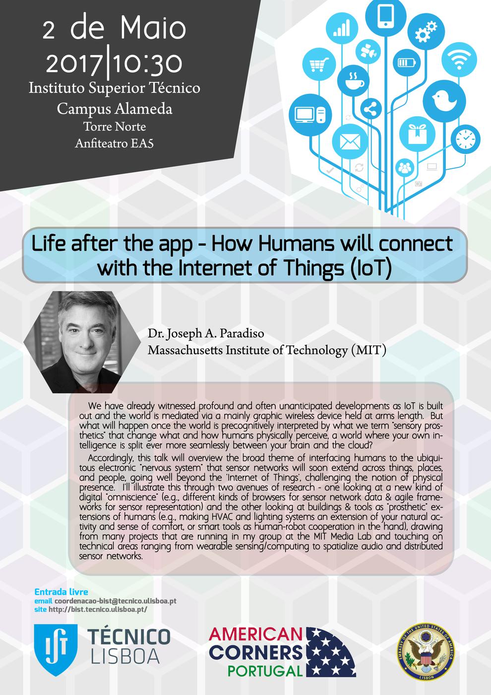 Joseph A. Paradiso (Massachusetts Institute of Technology – MIT) will give the lecture “Life after the app – How Humans will connect with the Internet of Things (IoT)” on May 2, at 10.30 a.m., within the protocol between the US embassy in Lisbon and Instituto Superior Técnico (IST/ACorner).