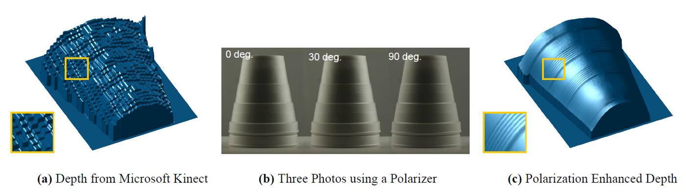 Above: Starting from a coarse depth map, is it possible to achieve laser scan quality? By combining the information from the Kinect depth frame in (a) with information in 3 polarized photographs (b) , we reconstruct the 3D surface shown in (c). The subtle change between polarization images provides additional information about surface orientation.