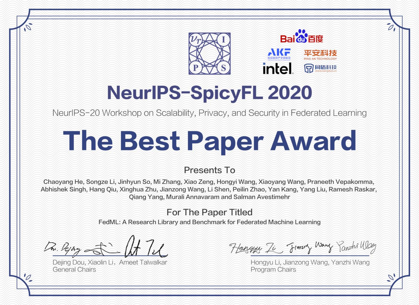 A multi-institutional team, including Camera Culture group head Ramesh Raskar, PhD student Praneeth Vepakomma, and research assistant Abhishek Singh, has won the Baidu Best Paper Award at NeurIPS-SpicyFL 2020 (as part of the Workshop on Scalability, Privacy, and Security in Federated Learning) for the paper "FedML: A Research Library and Benchmark for Federated Machine Learning."