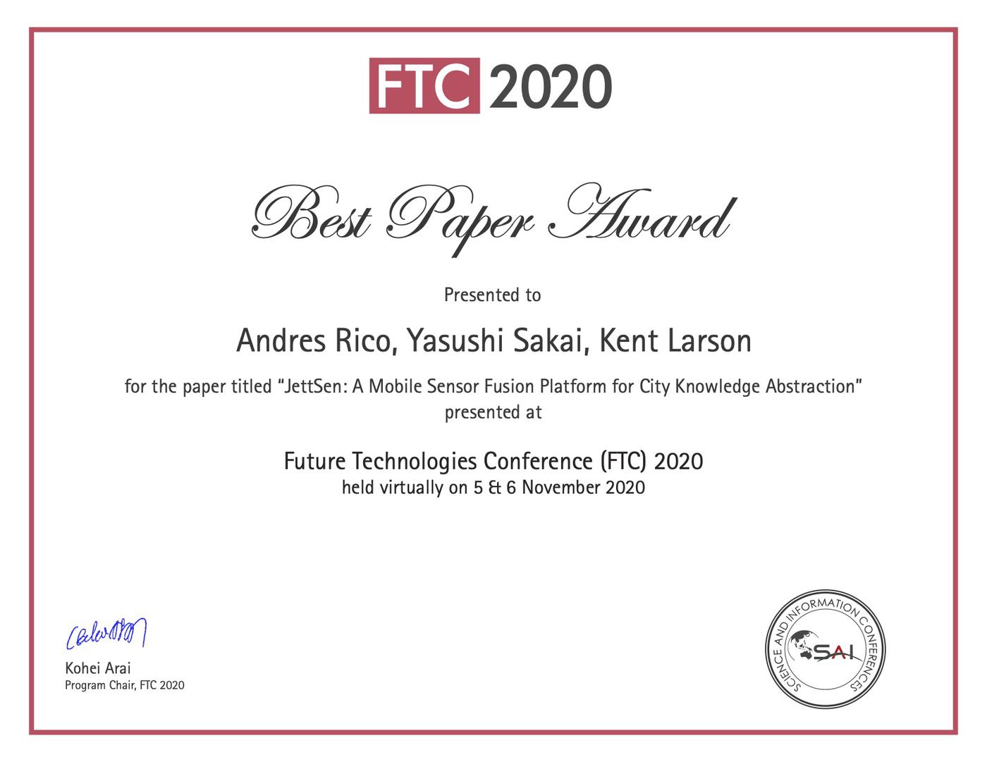 A team of City Science researchers including Andres Rico, Yasushi Sakai, and group head Kent Larson have received the Best Paper Award at Future Technologies Conference 2020 for the paper titled "JettSen: A Mobile Sensor Fusion Platform for City Knowledge Abstraction."