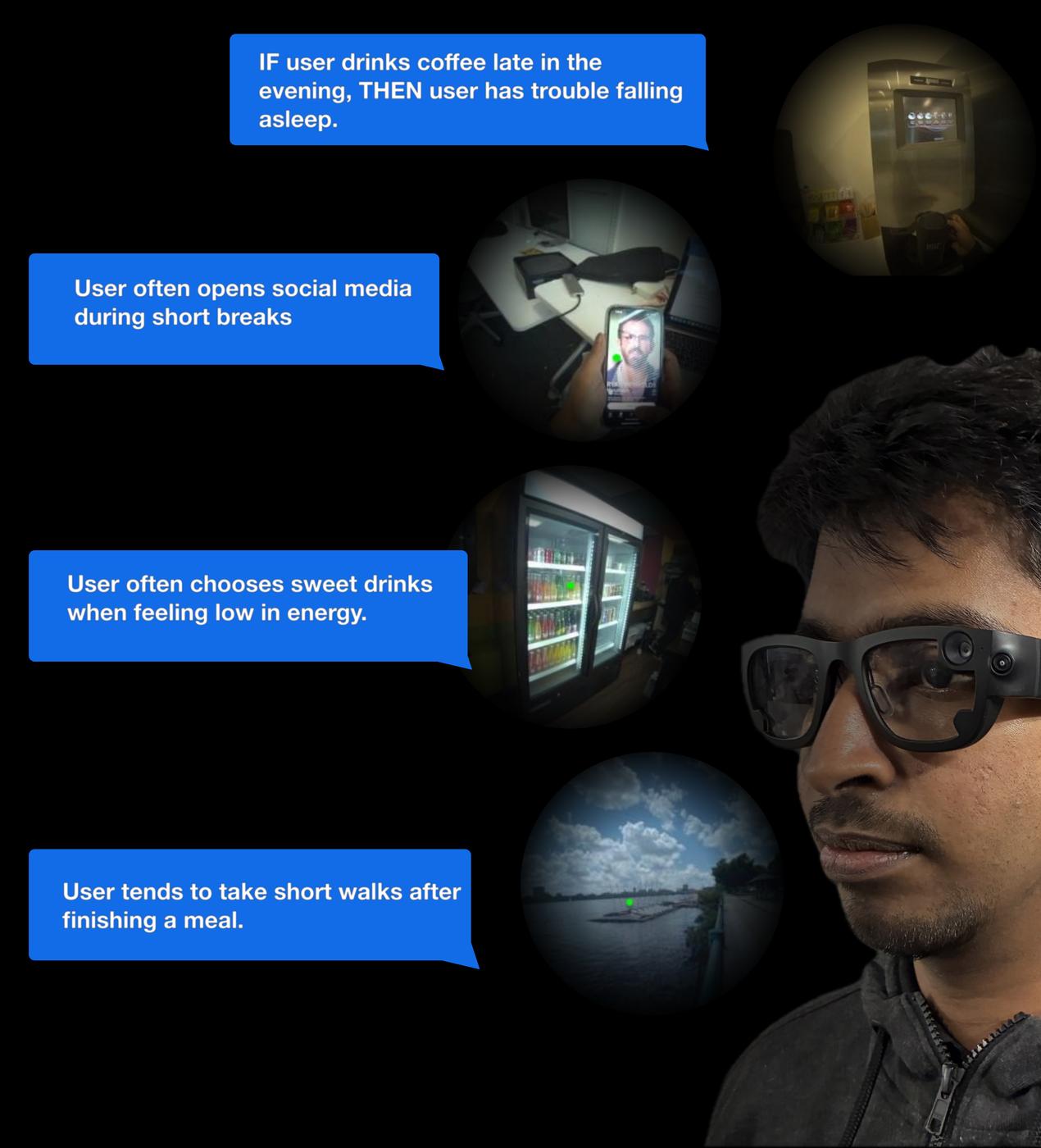 The way we move, glance, and react reveals more than we realise—patterns that reflect our minds in motion. Yet much of this behavioural intelligence remains unnoticed. Through a multimodal wearable interface, Chetana uncovers the latent patterns embedded in everyday behaviour, integrating visual, auditory, and physiological cues. This shifts wearables from reactive devices to proactive systems that sense context, anticipate needs, and deliver adaptive support in real time. By modeling how people think, feel, and act across situations, Chetana enables new forms of behavioral and cognitive support—ranging from memory augmentation and self-awareness to task guidance and beyond.