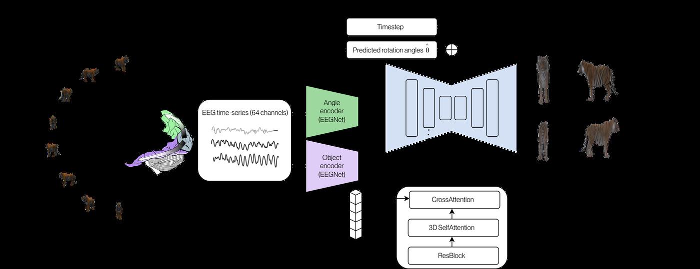 (3) We establish the feasibility of EEG-conditioned 3D reconstruction through multiview diffusion, enabling direct generation of 3D objects from neural signals. Further investigation of geometric priors through comparison with steerable CNNs and equivariant architectures would quantify the benefits of biological versus purely geometric inductive biases for 3D brain decoding. Quantitative evaluation through single-view versus multiview reconstruction metrics and analysis of rotational equivariance properties would further validate the geometric understanding captured by our dual-stream approach.