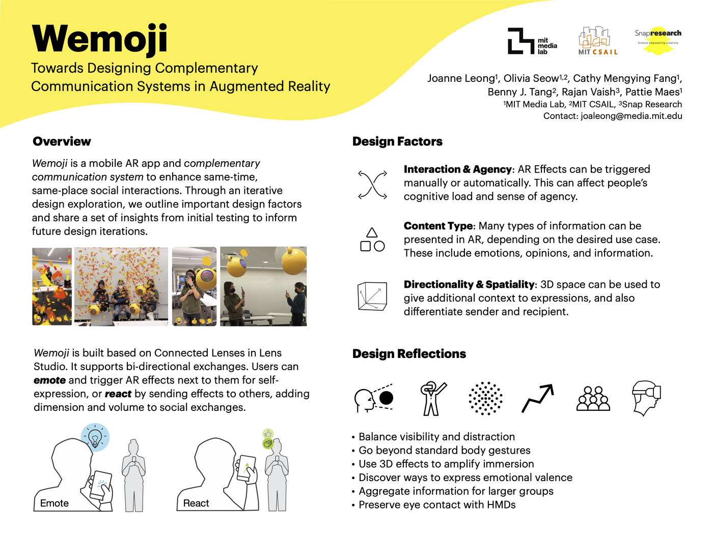 Joanne Leong, Olivia Seow, Cathy Mengying Fang, Benny J. Tang, Rajan Vaish, and Pattie Maes. 2022. Wemoji: Towards Designing Complementary Communication Systems in Augmented Reality. In The Adjunct Publication of the 35th Annual ACM Symposium on User Interface Software and Technology (UIST ’22 Adjunct), October 29-November 2, 2022, Bend, OR, USA. ACM, New York, NY, USA, 3 pages.